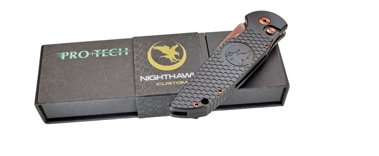 Elevate your everyday carry with this exclusive Pro-Tech TR-3, created to reflect the uncompromising character of Nighthawk Custom. This special edition showcases our signature dimple pattern precision-machined into a black anodized aluminum handle, delivering a distinctive, hard-use appearance and a grip that feels secure and authoritative in hand. The Moon Hawk logo is prominently featured on the handle, signifying its place as a true Nighthawk collaboration.