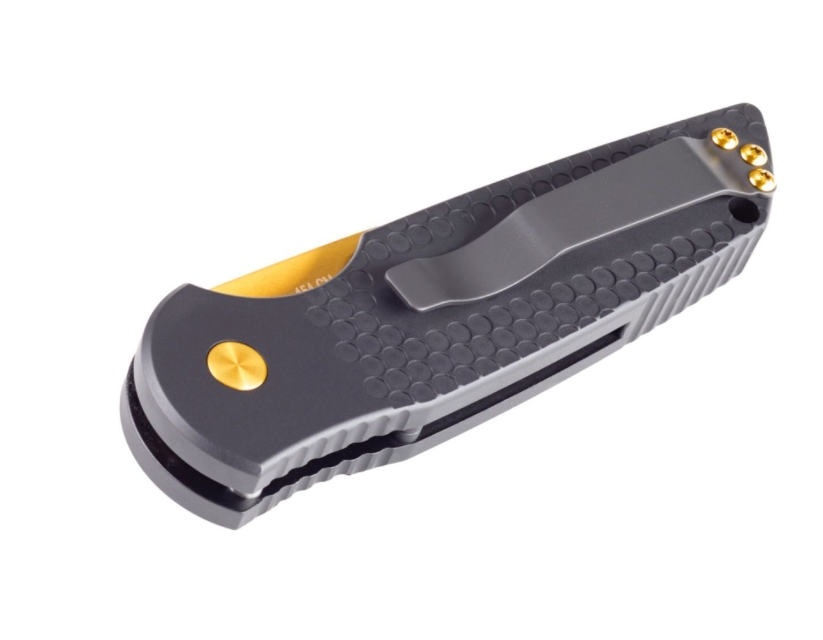 This exclusive version of the TR3 features a striking Gold TiN blade finish, offering both enhanced durability and a bold, refined look. Crafted from 154-CM stainless steel, the blade delivers exceptional toughness, corrosion resistance, and superior edge retention. Complemented by black steel hardware and a gold TiN release button, this knife is a statement of performance and craftsmanship, built to withstand the demands of hard use while exuding a level of elegance that sets it apart.